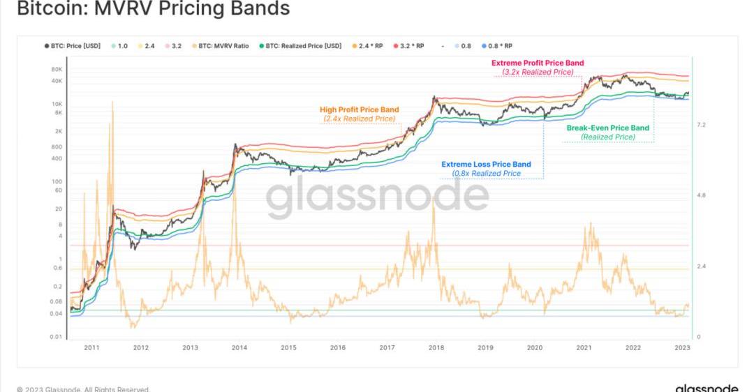 現在我們已經為MVRV定義了一組“極端層級”,我們可以將它們可視化為定價區間。如果MVRV比率等于2.4,則意味著相應的盈利定價范圍是已實現價格的2.4倍。