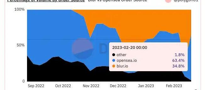 下圖顯示的數據中,Blur是橙色部分,它在2月19日占了83%的交易執行量。然而,在2月20日,該數值下降到26%,造成這種下降的原因是Blur的初始Token剛剛結束了空投。