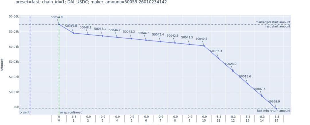 明白了這些信息后,結合實際體驗過程中的所調用的函數和resolver的作用,不難推斷出其實FusionSwap功能就是利用限價訂單的模式,把兌換率設置為用戶可以獲得的最低數量的代幣反向計算出來的兌換率,然后剩余的浮動部分,也就是用戶額外能得到的交給resolver來決定。隨著時間的推移,用戶能得到的部分會越來越少,但是這個“少”僅僅是resolver決定的少,而并不體現在鏈上,畢竟用戶簽名的訂單信息,已經設置了最低的兌換率。