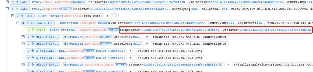 7.通過另一個子攻擊合約0xA0b3ee調用清算函數去清算上一步中處于可被清算狀態下的賬戶0x583c21。
