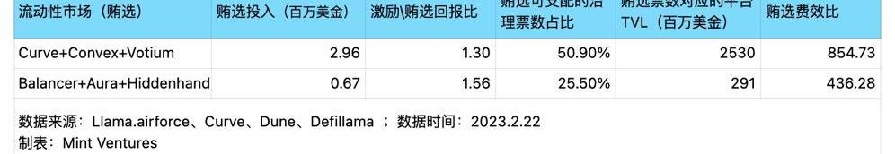 從賄賂投入到TVL的數據結果來看,盡管采購成本能在balancer能獲得更高價值的流動性激勵排放,但是從最終獲得TVL的角度來說,還是Curve這邊能提供更高的TVL。
