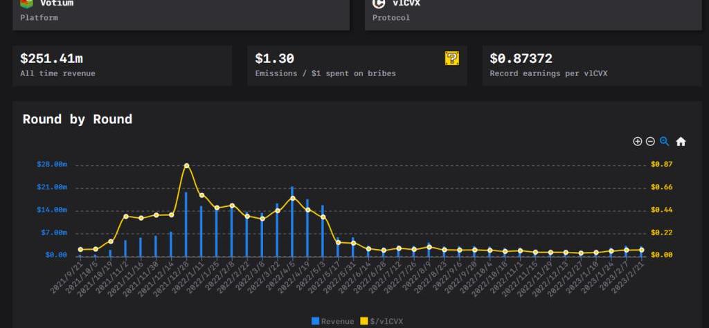 根據Llama.airforce的對Curve最主要的賄選平臺Votium的最近一輪賄選數據統計,該輪賄選流動性采購方共出資296萬$價值的代幣,對Convex控制的veCRV投票權進行采購。通過賄選采購,所有的流動性采購方為自己的Pool買到了彼時價值約為385萬$的CRV和CVX排放。