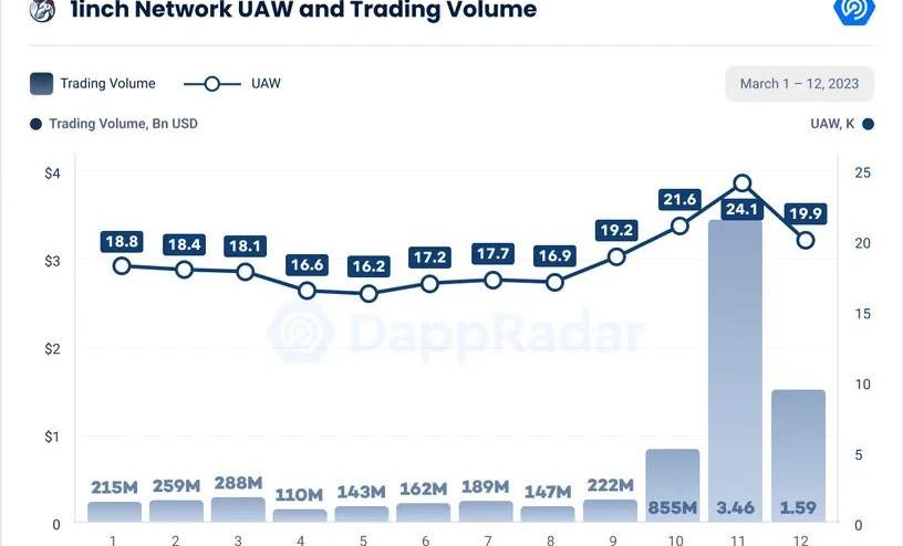 DeFi?聚合器?1inch?Network?在周六創下了?34?億美元的?Dapp?交易量紀錄,在?DeFi?Dapp?中排名第二。1inch當天注冊超過?24,?000?獨立活躍錢包,表明其在?DeFi?領域廣受歡迎。