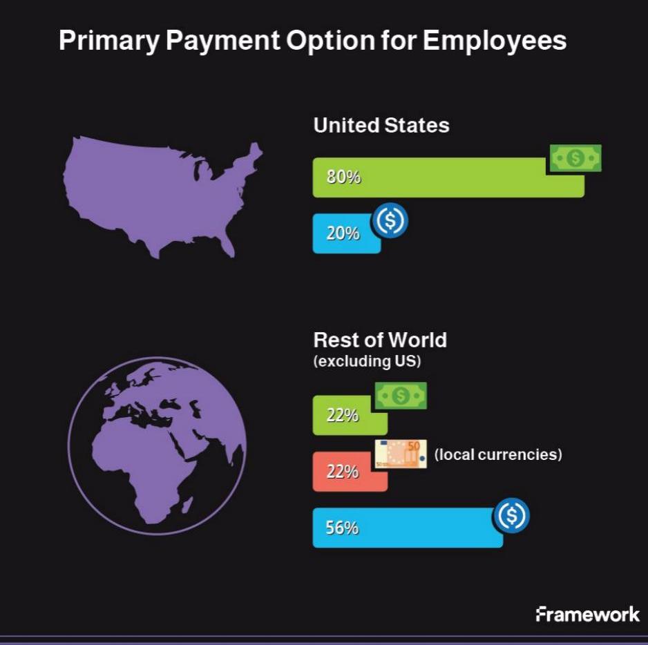 對于Web3中的國際團隊,已經有大多數受訪公司提供USDC或其他穩定幣作為所有員工的主要報酬形式。