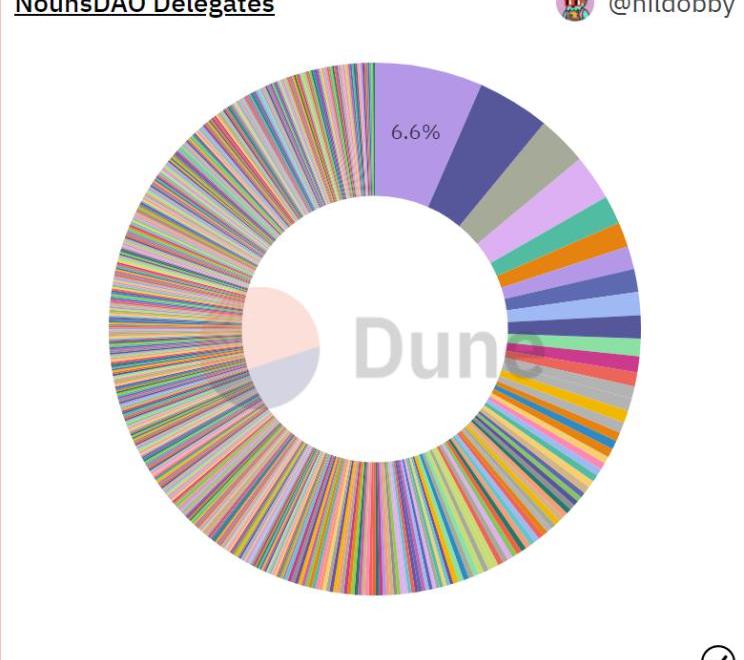 到目前為止,Nouns投票權分布良好,將近一半的投票權屬于僅有一個Nouns的持有者。同時,只有不到25%的投票權集中在鯨魚身上。