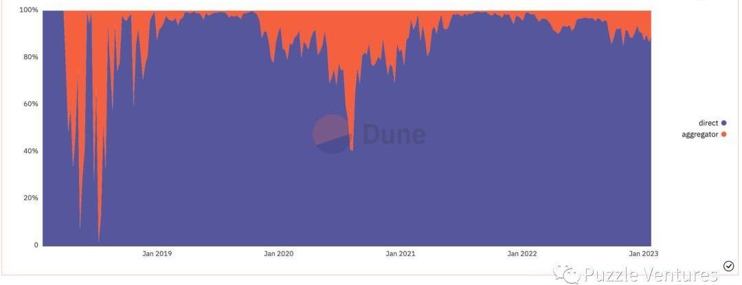 All-timeNFTVolumeTrendfromDirectMarketplaces(blue)VS.Aggregators(orange).(Source:Zoe’sDuneQuery)