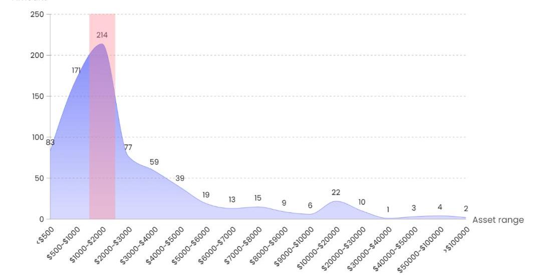 8.“巨鯨”的資產極度拉高了整體的人均資產,對748個NFT項目進行人均資產計算,平均數為$4,137,中位數為$1,461。人均資產的分層也讓NFT玩家形成了不同消費能力的群體,讓NFT項目方針對不同用戶需求設計產品和分層營銷。