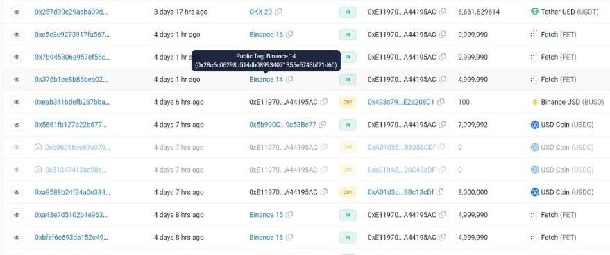 鏈上數據顯示,AmberGroup在2月14日從幣安交易所將FET轉出,這意味著他們很可能提前布局了人工智能風口的項目代幣并且在幣安平臺上購買了FET,然后在熱潮褪去并獲得收益之后又將這些代幣轉入自己的鏈上地址。