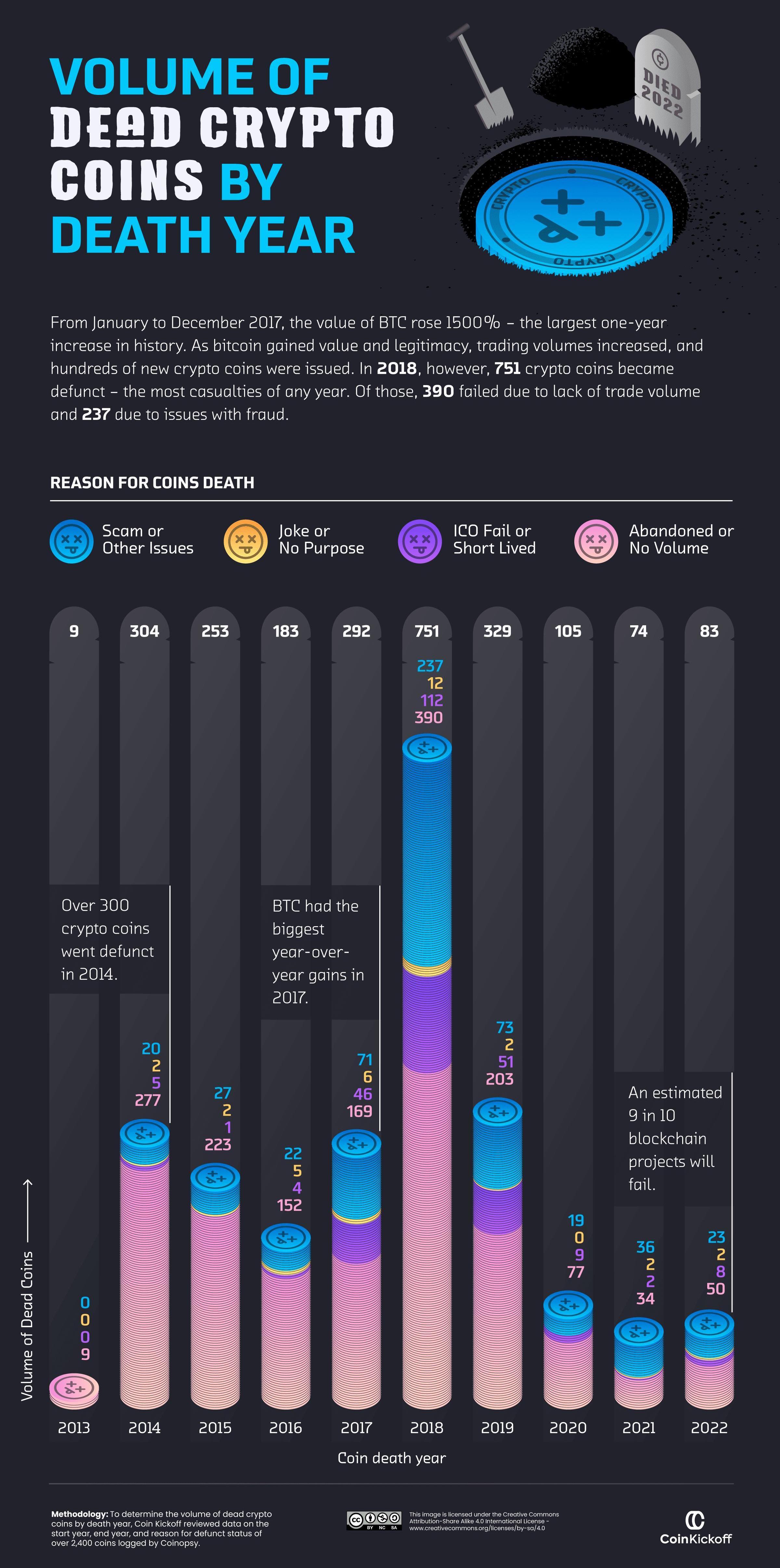 失敗的原因包括首次代幣發行失敗、三個月內交易量低于1000美元而被棄用、詐騙或這些幣本身只是項目方隨便發行的。