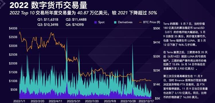 2022全年,排名前10中心化交易所總交易量達到40.87萬億美元,相比于2021年,下降了超50%。全年共計三次日交易高峰,分別發生于5月,6月和11月。