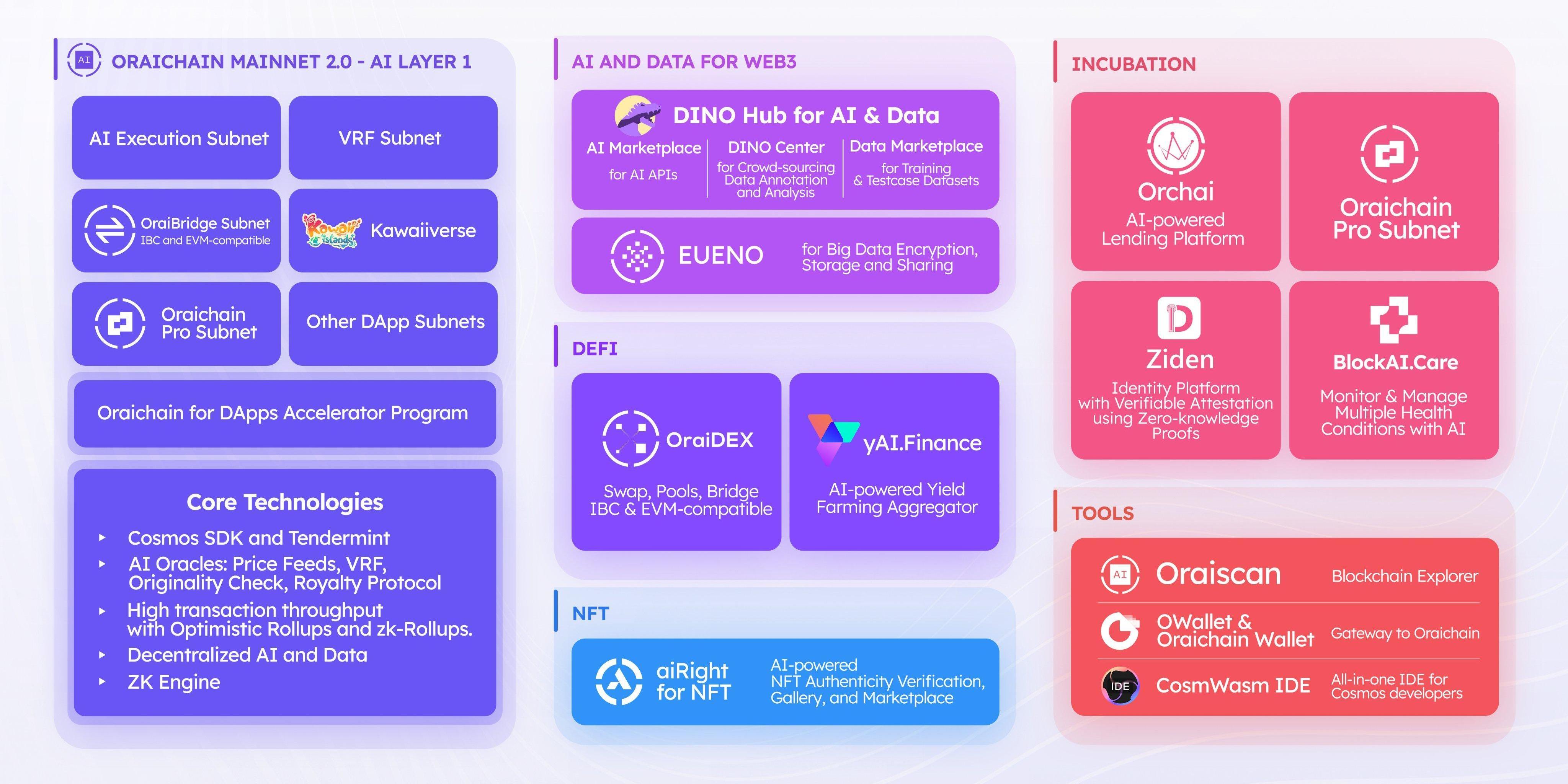 Oraichain是一個由AI驅動的區塊鏈預言機和生態系統。除了數據預言機,Oraichain的目標是成為區塊鏈領域中具有完整人工智能生態系統,作為創建智能合約和Dapps的基礎層。以AI為基石,Oraichain開發了許多重要的創新產品和服務,包括AI喂價、完全鏈上VRF、DataHub、具有100多個AIAPI的AIMarketplace、基于AI的NFT生成和NFT版權保護、RoyaltyProtocol、人工智能驅動的收益聚合器平臺和CosmwasmIDE。