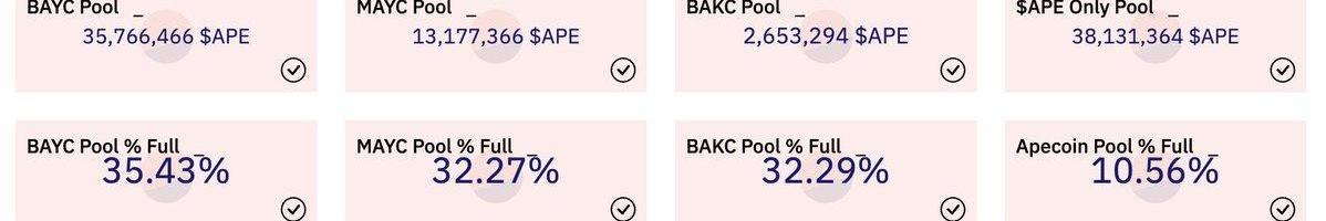 BAYC/MAYC/BAKC/APE幾個質押池,目前參與質押的比例還很低,在達到每個質押池的上限之前仍有大量的流動性和NFT需求。