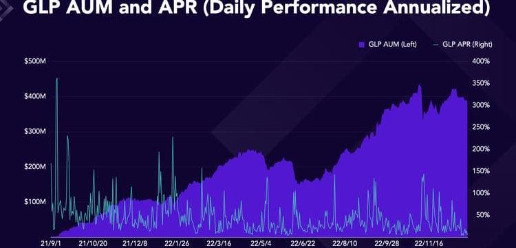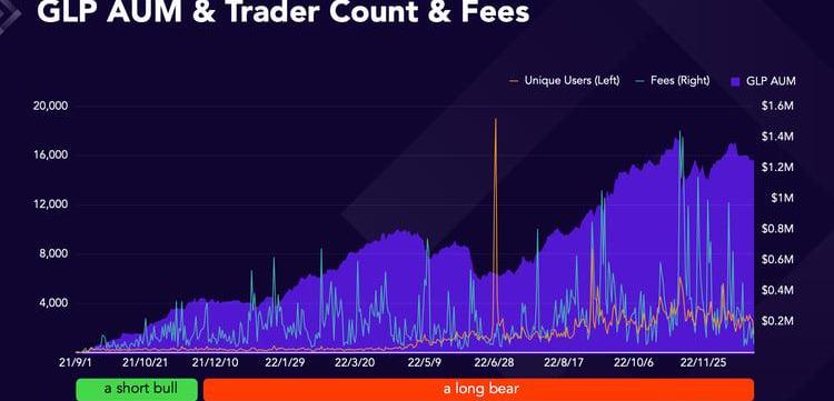 GMX在2022年迅速崛起,因為有關真實收益率的討論席卷了CryptoTwitter。Degens從高度通脹的Token轉向了像GLP這樣提供$ETH收益的Token。在2022年的大部分時間里,GMX的GLP持續實現了20%+的APR,這甚至在Terra最輝煌的日子里使Anchor相形見絀。盡管宏觀環境導致加密市場整體下行,但是GLP在保持極具競爭力的APR的同時,實現了逆勢增長。