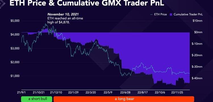 GMX15個月的歷史可以分為兩個部分。第一階段從2021年9月1日到2021年11月10日,是一個短暫的牛市,ETH沖到了歷史高點。從2021年11月10日起的第二階段,是漫長而痛苦的熊市,ETH下跌了70%以上。