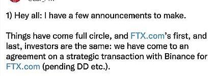 原文大致翻譯如下:大家好:我有幾個消息要宣布。事情已經圓滿結束,http://FTX.com的第一個,也是最后一個投資者是相同的:我們已與Binance就FTX.com戰略交易達成協議(等待盡職調查結果)。