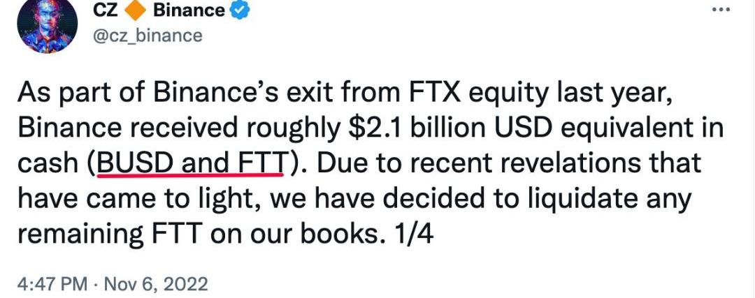 由于幣安拿到手的是BUSD和FTT,并且有跡象表明他們沒有清算手里的FTT,因此由于FTT價格暴跌,將被收回的金額應該遠低于21億美元。