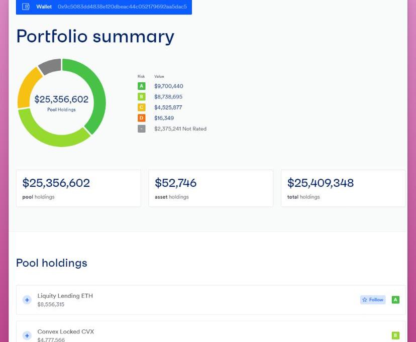 「評價錢包」功能會為你提供當前投資的風險分析。例如,在Tetranode的資產中,就有450萬美元的資產是被存入在風險較高的協議中。