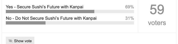 Kanpai的概念誕生于2021年6月的一項治理提案,其作用是從xSUSHI的0.05%收入中再抽取一部分,用于補充Sushi財庫收入并豐富財庫資產類別,以應對隨時會到來的熊市。簡單來說,Kanpai是一個參數,代表了財庫和xSUSHI持有者的分配比例,當前該參數為10%?,意味著財庫分配10%?,xSUSHI持有者分配90%?。