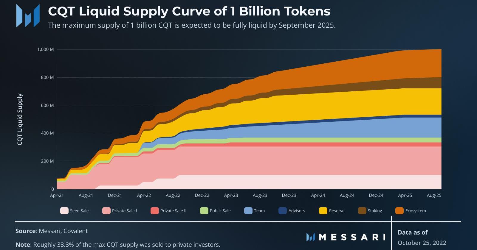 CovalentQueryToken在以太坊上推出,最大供應量為10億,有不同的歸屬時間表。在這些供應中,大約有33.3%被分配給上述的私人銷售參與者。團隊和顧問被分配了大約16.4%的最大供應量。其余的分配約占最大供應量的50.3%。