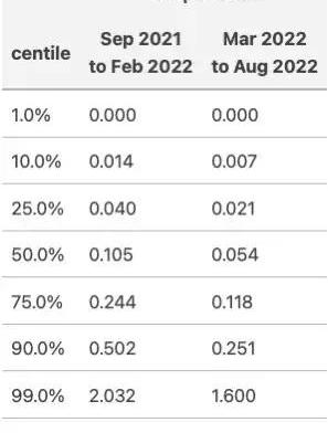 由于我們長達一年的數據集中的礦工收入水平并不穩定,我們可以用更為詳盡的方式來比較數據集的前后兩個部分。下圖展示的是數據集兩個部分的ECDF,其中藍線表示的是數據集的前半部分,橙線表示的是后半部分,而藍線則明顯低于橙線。X軸上顯示的是收入數據,而在每個四分位數,礦工收入水平在數據集的前半部分都會更高。前面圖表中顯示的整個數據集的ECDF將落在這兩條線之間。如下表所示,每個區塊在后六個月的中位數MEV都大致等于前六個月的一半。
