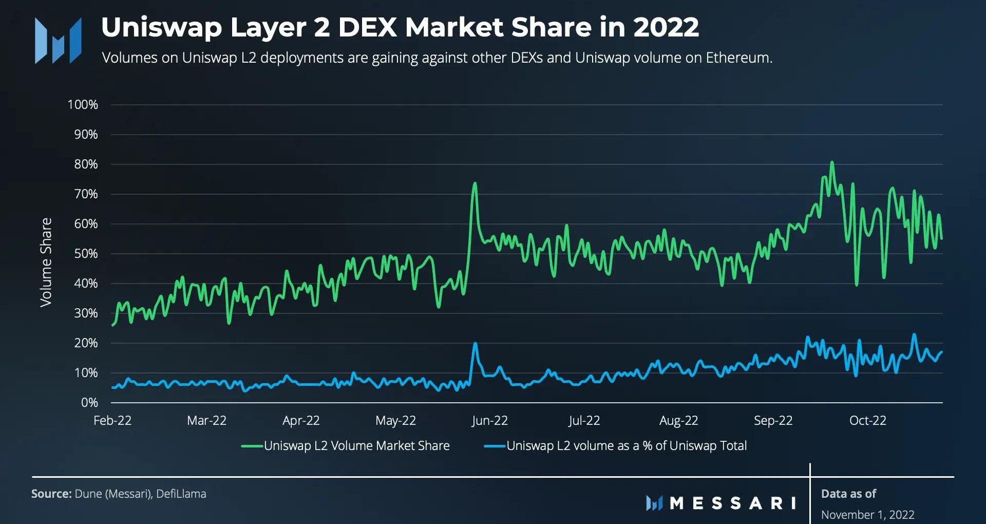 除了以太坊主網,UniswapV3隨后被部署到基于EVM的擴容方案Optimism、Arbitrum、Polygon和Celo。這些部署迅速吸引了其他DEX的流動性和交易量。這些部署所提供的流動性高達2.46億美元,2022年第三季度,這些鏈上超過65%的DEX交易量都通過Uniswap進行。Uniswap部署的L2交易量已經占到該協議總交易量的近20%。