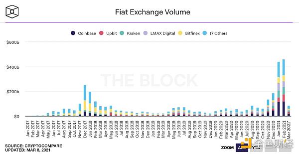 二月份,加密貨幣現貨交易額再創歷史新高,超過1萬億美元,比2017年最高水平還高出三倍以上。在支持法定貨幣交易的加密貨幣交易所中,Coinbase在交易額方面遙遙領先,其次分別是Kraken、Upbit、LMAX Digital和Bitfinex。