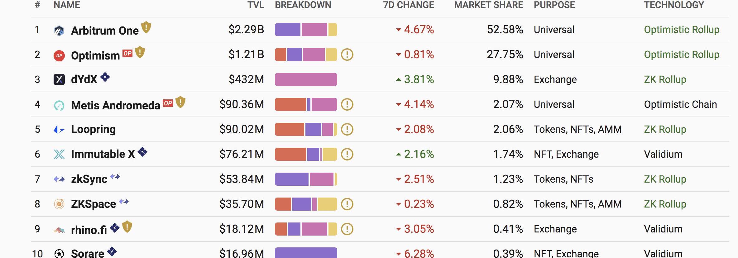 在L2市場上,無論從TVL還是日交易數量看,Arbitrum和Optimism都占據較大優勢。截止到寫稿時,其中Arbitrum的TVL市場份額為52.58%,Optimism占據27.75%,OptimisticRollup技術項目占據了80%以上的TVL份額。