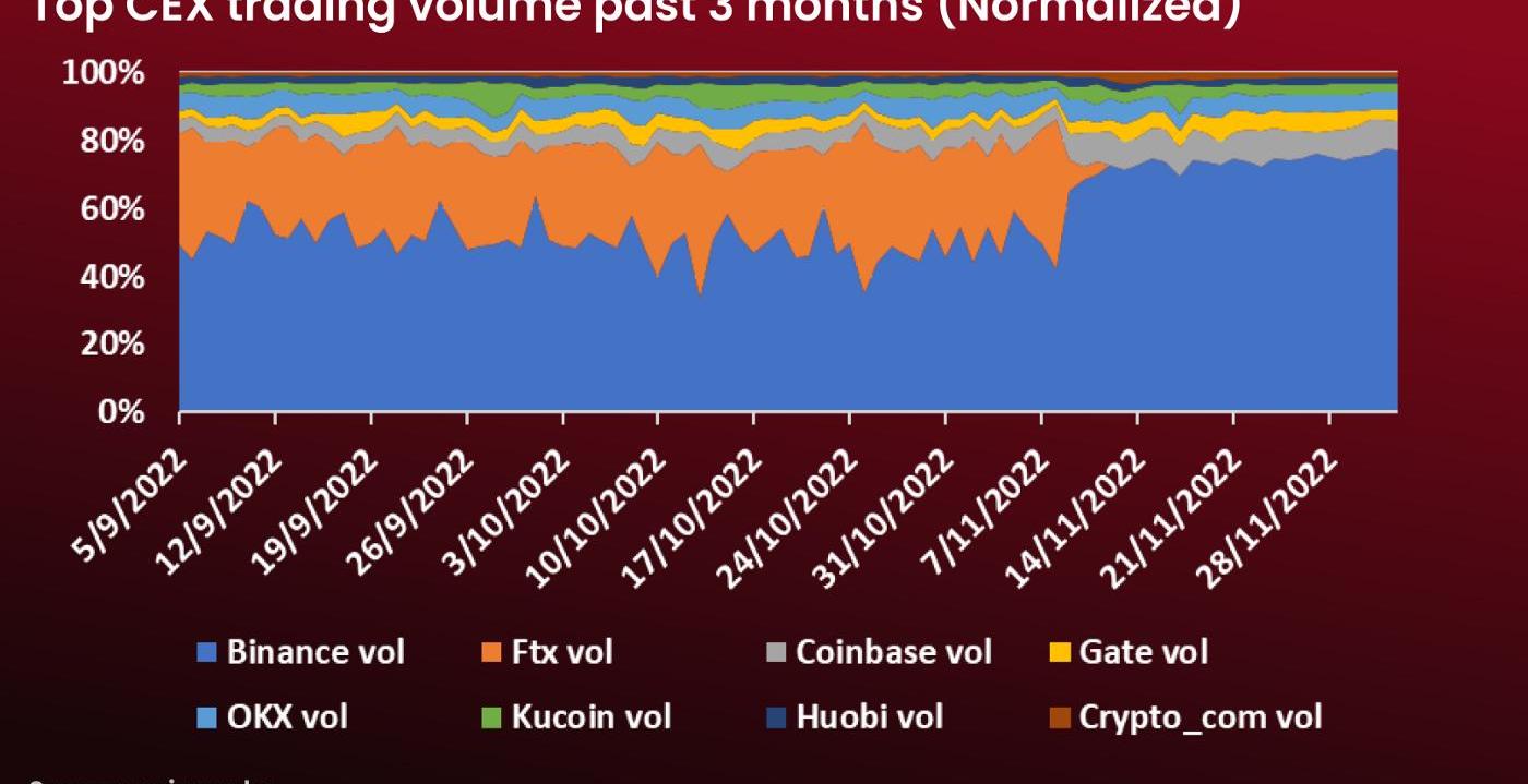 首先,讓我們看看CEX交易量在FTX破產之后是如何變化的。顯然,我們可以看到,從11月7日,FTX資不抵債后,頂級CEX交易量大幅下降。從日均300多億的交易量降至目前日均100億的交易量。誰將吞噬大部分FTX的交易量?