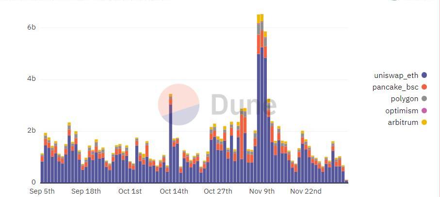 對于DEX交易量,我們從以太坊、Polygon、BSC、Optimism和Arbitrum每個鏈中選擇頂級DEX進行分析。有趣的是,隨著FTX崩潰,我們可以看到DEX發生與CEX相似的情況:交易量飆升。除此之外,DEX競爭不分伯仲。