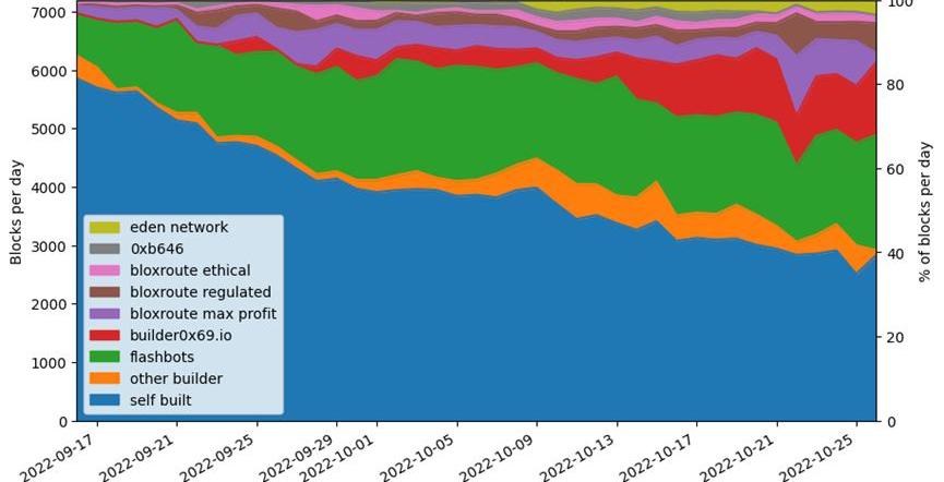 在下面的圖中,我們可以看到一個明顯的趨勢,即提議者建設自己的區塊的比例從數據集的第一天的81%下降到最后一天的39%。由Flashbots操作的建設者最初增長很快,但buidler0x69逐漸追趕了上來。BloXroute的一組建設者在過去幾周保持了相對穩定的市場份額,其他參與者占的區塊比例相對較小。同樣,由于我們只有幾周的數據,這個市場會如何發展還是個未知數,但要注意到自合并以來,驗證者建立自己的區塊的比例持續下降,相當穩定地下降。