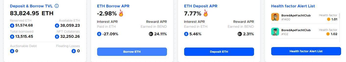 目前,BendDAO目前借貸池總流動性為51574ETH,可用流動性為38059ETH,資金ETHDepositAPR為5.46%,資金利用率為26.21%。平臺已支持BAYC、CryptoPunks、MAYC、Azuki、Moonbirds、CloneX、Doodles、SpaceDoodles等八個藍籌NFT項目。