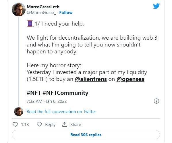 2022年1月,一名著名的外國攝影師MarcoGrassi.eth就曾經在OpenSea上以1.5ETH買入一張名為「alienfren#7085」的NFT,并在幾小時后將它以2.9ETH轉售。然而,沒想到購入不久后他就收到OpenSea的官方通知,指他購入的NFT是贓物,并凍結這個NFT的交易。