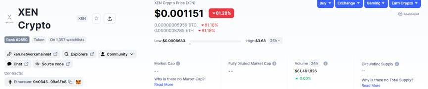 根據CMC的數據,XEN的價格在創世后立即飆升至1美元,但已回落至0.0011美元。目前它只能在Uniswap上交易,那里的流動性非常少,無論是從評論還是各方面資料都似乎證明這是一個騙局。