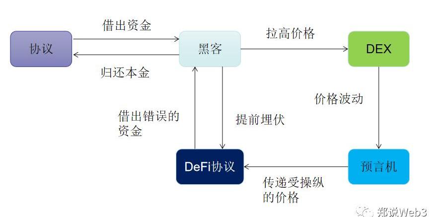 ???5、DeFi協議在收到預言機的喂價后,黑客按當前受操縱的價格將提前埋伏的幣種進行抵押借款,從而獲得大量的資金;