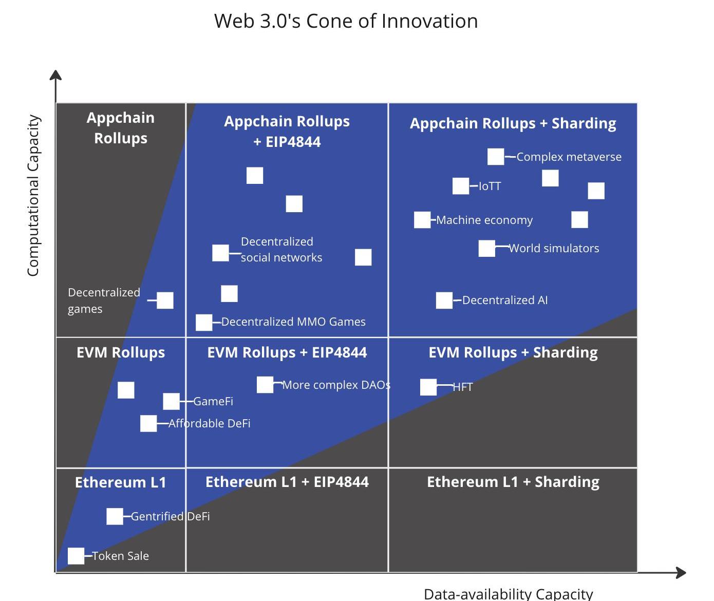 該圖被劃分為幾個主要的區域,代表了正在結合的擴展解決方案以及它們在計算和數據容量方面的表現。當我們從以太坊Layer1轉移到EVMrollup,然后再到專用應用鏈時,計算能力在提升,而數據隨著EIP-4844和分片的加入而得到改善。藍色部分顯示了隨著兩個維度的升高,應用的可能性也就更高。我們把藍色區域稱為web3的創新區域。