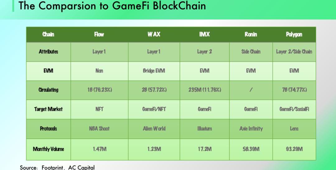 Polygon:我們將Polygon擺在這里可能有些不準確,作為以太坊最為成功的Layer2orSideChain,Polygon在GameFi的成績尤為耀眼。首先,兼容EVM讓開發者可以很輕松地將以太坊的協議遷移過去,不需要花費太多的力氣。Polygon很好的承接那些以太坊生態外溢,協同頭部協議建立起基礎設施。不僅如此,為更好的健全公鏈生態,開發團隊成立了PolygonStudios孵化GameFi協議。參考Footprint對于公鏈GameFiVolume的統計數據,Polygon遠高于其他競爭對手。WAX:WAX成立于2017年,是本輪行情中表現最好的老牌公鏈之一。開發團隊在網絡性能、經濟模型、價值循環、生態建設的建設上都有不少的亮點。首先,WAX的區塊鏈結構與EOS很像,優異的性能足夠支持游戲所需的高吞吐量。其次,WAX的價值以鏈上NFT經濟活動為做價值支撐,這樣既可以提升游戲體驗,又可以保證WAX持有者在生態發展中獲益。更為重要的是,為豐富鏈上生態,WAX建立跨鏈橋來兼容以太坊,通過WAXE、WAXG和WAXE-ETH實現WAX與以太坊的深度綁定。WAXLabs成功孵化出FamersWorld、AlienWorlds等游戲。然而隨著市場向下調整,鏈游交易量縮水嚴重,WAX同樣進入發展的低潮期。Flow:得益于DapperLabs強大的資源能力,Flow推出的NBATopShot在2021年爆火,吸引大量用戶進入社區。然而在GameFi快速發展期,DapperLabs并沒有跟上節奏,團隊沒有及時將手中Web2.0資源向Flow賦能,導致生態建設陷入停滯。因為不兼容EVM,Flow相對于開發者沒有那么友好,以高開低走來形容Flow過去兩年的表現再為恰當不過。Ronin:AxieInfinity在2021年引爆GameFi的浪潮后,以太坊的網絡性能嚴重阻礙了游戲的發展。AxieInfinity團隊把協議遷移到Ronin,網絡容量大幅提升帶來用戶量的翻倍增長,截止當前,Ronin仍然是交易量最高的游戲公鏈。雖然AxieInfinity是本輪GameFi浪潮中的最大贏家,但Ronin更像是Axie的單體鏈,而在市場陷入低潮之后,Ronin推出的幾款游戲表現平平,難以留住玩家,用戶大都選擇通過Bridge將Ronin資產撤回到以太坊主網。Ronin沒有展示出GameFi的創新與孵化能力。IMX:ImmutableX是基于以太坊的Layer2,依托于StarkWare的ZK-Rollup,IMX可以在擴展網絡性能的同時保證安全。IMX的一些設計非常亮眼,比如,用戶可以零手續費Mint/TransctionNFT、網絡采用Validium驗證方實現高吞吐量。由于投資陣容強大,網絡性能優異,項目一上線就被投資者寄予厚望。可是相比于同為GameFiChain的WAX,IMX后期的運營發展并不盡如人意。直到現在,頭牌項目ILV依舊沒有上線,在熊市時期,網絡的交易數量已經遠遠落后于Poylgon、WAX等其他公鏈,2022年底,IMX將會有大量融資輪通證釋放,盡管創始人宣稱將會繼續鎖倉1年,但是機構輪的通證仍然會釋放。在高通脹壓力的環境下,團結社區將會變得更加困難,IMX或許已經錯過了發展的最佳時機。當一個經濟體的發展陷入停滯,貨幣卻正在加速膨脹,那結果只可能是資本外逃與匯率暴跌。