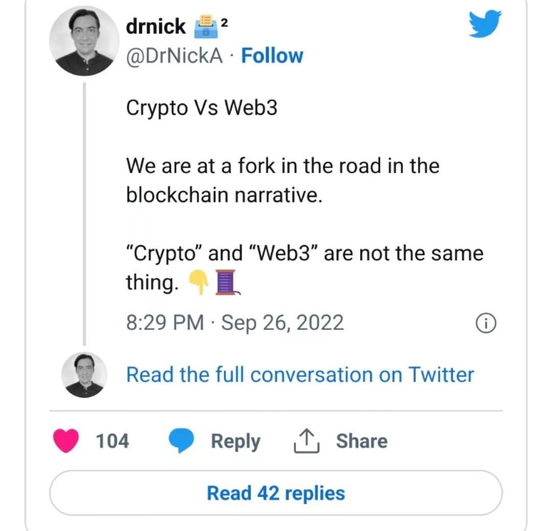 XRP/HKD+1.1%自從去年Web3概念大火,一直以來我都沒有特別注意Crypto和Web3兩個名詞的區別,大多數情況把其等同起來。直到看到推特@DrNickA的一條區分CryptoVSWeb3的置頂推文: