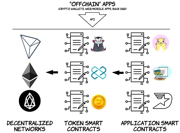 這些在分散式網絡上運行的安全且不可更改的程序與傳統的前端和后端技術相結合,今天被稱為分散式應用程序(DApps)。通過其中的一些可以半集中,真正去中心化的應用程序中的大部分活動應該發生在中央的控制之下。