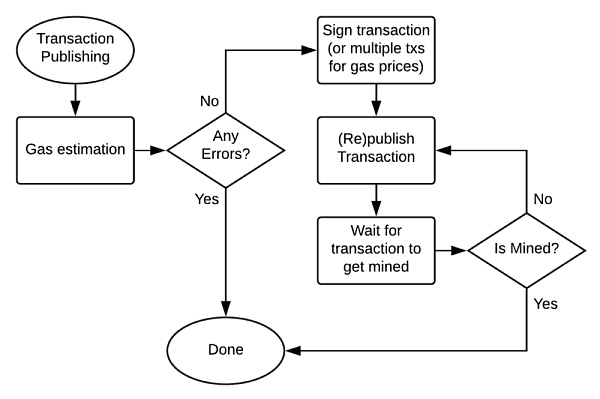 如果花費的時間太長而我們無法獲得交易的狀態,則必須重新發布它或觸發“失敗情況”。交易可能由于各種原因而丟失:網絡擁塞,對等體掉落,網絡負載增加等。在以太坊中,您還可以考慮以不同的(實際)汽油價格重新簽署交易。