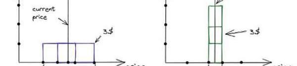 在此示例中,兩個流動性提供者擁有頭寸。LP1的頭寸窄幅為3美元。LP2擁有5美元的寬頭寸。在這種情況下,如果價格沒有超出LP1的持倉范圍,他將獲得比LP2多3倍的費用。因為LP2在這個范圍內只有1美元,而這1美元正在與LP1的3美元競爭。