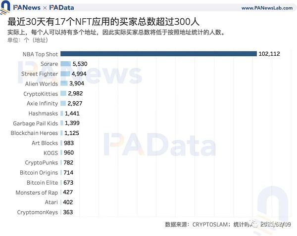 如果將每個地址都看作是一個獨立的買家的話,那么最近30天,有17個NFT應用的買家人數超過300人,其中9個應用的買家人數超過1000人。其中,NBA Top Shop最近30天的買家人數達到了10.21萬人,是排名第二的Sorare的18倍左右,是排名第17的CryptomonKeys的281倍左右。但是,可能存在多個地址歸屬于同一個買家的情況,因此真實買家總數將大大低于按照地址統計的個數。也就是說,每天有10個及以上真實買家的應用數量僅有10至15個左右。