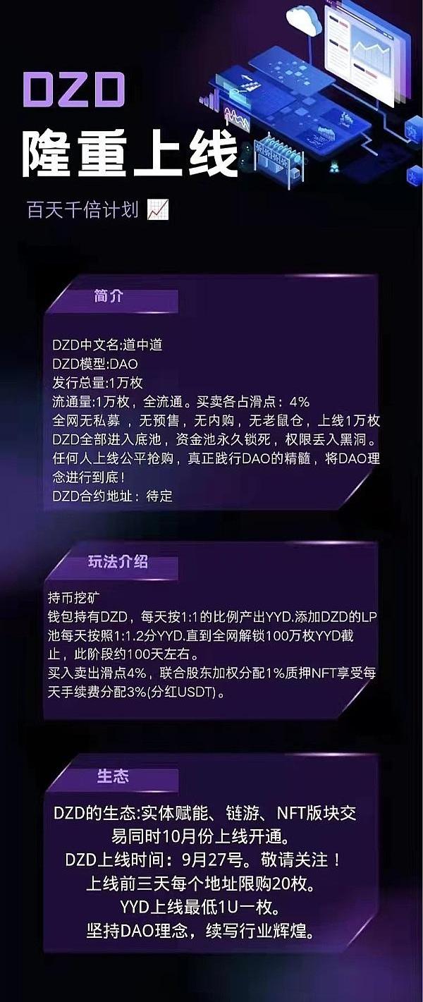 全網無私募,無預售,無內購,無老鼠倉,上線1萬枚DZD全部進入底池,資金池永久鎖死,權限丟入黑洞。任何人上線公平搶購,真正踐行DAO的精髓,將DAO理念進行到底!