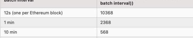 為了給我們一些具體的數字,讓我們考慮一個每批成本為600,000gasZKrollup并處理每筆交易成本為368gas的完全優化的ERC20傳輸。假設此rollups處于采用的早期到中期,TPS為5。我們可以計算每筆交易與批次間隔的gas: