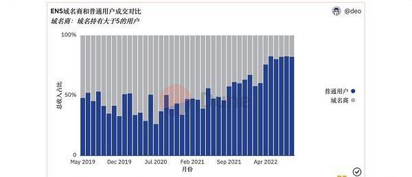 從成交結構來看,炒作泡沫正被消化,實際的用戶數開始擴大。整體來看,ENS依然存在炒作行為。域名總數量約235萬個,而實際用戶數約55萬人,人均域名持有量約為4。根據Dune@andrewshvv,將域名商人與普通用戶的成交額對比,普通用戶的成交額在穩步上升,這意味著更多的注冊用戶是持有域名較少的普通用戶或新用戶。而隨著域名應用場景的進一步擴大,域名炒作的比例會進一步縮小。