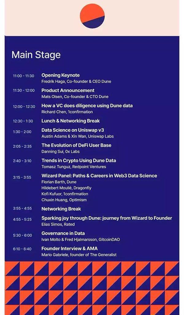 XRP/HKD-4.33%原文來源:@Dr.DODO加密數據分析平臺Duneanalytics?于9月15日在柏林舉辦了DuneCon?大會。會議分為MainStage和Studio兩個會場,其中MainStage約持續8小時。邀請了包括UniswapLabs、0xLabs、1confirmation、Optimism等在內的嘉賓分享他們和Dune以及blockchaindata的奇遇。