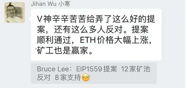 此外吳忌寒在BCH蜂群中表達了對EIP-1559的支持,明確表示,該提案如果順利通過,ETH價格大漲,礦工也是贏家。