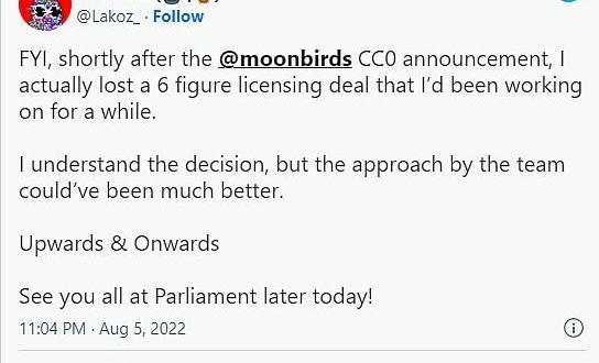 毋庸置疑,并非所有NFT持有者都感到高興。一些人抱怨說,一旦Moonbirds宣布切換到CC0,他們不得不退出許可協議,因為他們不再擁有許可藝術品的專有權。