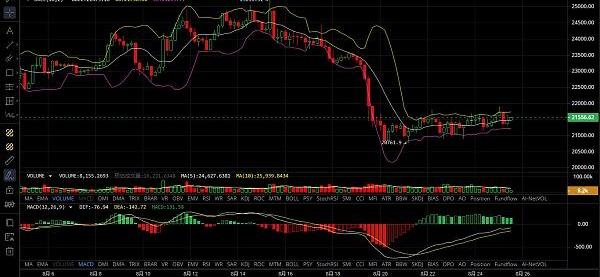 昨日大餅走勢和思路相同先漲后跌,昨日文章發出時符合多單進場點位,一路反彈上行至21900一線,多單止盈反手做空,低位跌至21300,恭喜跟上的朋友多空雙吃獲利1000美刀,小時圖看大餅行情昨晚沖高到21900一線受到壓制,日內持續走回踩下行,跌至下軌試探了支撐后,目前價格開始再次反彈上行走高沖破中軌后,開始向著上方去運行,短期趨勢開始走強明顯,MACD死叉綠色動能持續縮量,KDJ三線向上拐頭運行,等價格在中軌企穩支撐后,可直接做多,目標看向21900-22200,反手做空建倉位置,22200-22500,目標21900-21500