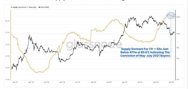 目前,1年的供應活躍度略低于2022年5月設定的65%的ATH值。這凸顯出2021年5月至7月,在大規模Miner遷移之后買家的堅定信念。過去三個月的均衡情況表明,BTC的成熟度與消費是平衡的。這可以被認為是熊市中的一種建設性機制。