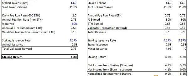 合并后質押率將從4.2%增加約100個基點至5.2%,但這并不意味著實際收益率有效增長。為了充分理解這種轉變,我們必須評估實際收益率而不是名義收益率。由于每年發行4.4%的ETH,所以雖然目前的應計收益率是4.2%,實際收益率接近0%。但是當合并之后,質押率增加到約5%,這將在很大程度上創造加密貨幣的最高實際收益率。唯一可以與之比較的就是實際收益率為1%的BNB。